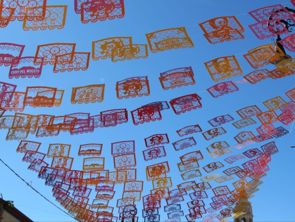 Papel picado is both placed on Dia de los Muertos altars and used to adorn the streets of Mexico during the season. (Photo: Luis Alvez, Wikimedia Commons, CC BY-SA 4.0)