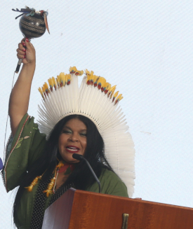 Sonia Guajajara leads the Ministry of Indigenous Peoples in Brazil. She worked on the Global Ethical Stocktake, an initiative to prioritize the needs of marginalized people in the fight against climate change. (Photo: Valter Campanato, Agência Brasil, Wikimedia Commons, Public Domain)