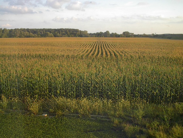Industrial farming is one of the driving forces behind prairie destruction. The practice of growing monoculture crops such as corn and soybeans uproots grasslands, depletes prairie soil, and increases the risk of pests, making farmers dependent on chemical fertilizers. (Photo: TwoScarsUp, Wikimedia Commons, CC0 1.0).