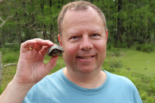 Don Lyman is a freelance journalist and adjunct professor of biology at Merrimack College. Pictured is Don holding a musk turtle at Lake Martin, Louisiana, in April of 2012. (Photo: Manny Salamanca, Courtesy of Don Lyman)