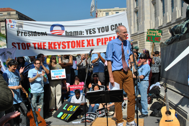 Bill McKibben speaks at a Stop the Keystone XL Pipeline rally outside the State Department hearing at the Ronald Reagan building in Washington, D.C., 2011. (Photo: Chesapeake Climate, Wikimedia Commons, CC BY-SA 2.0)
