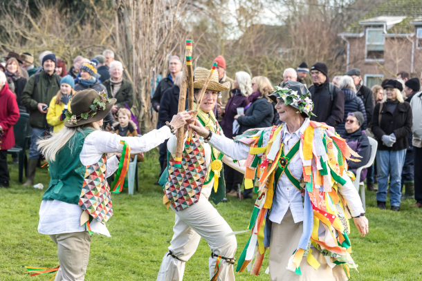 There are several Wassail events across South Western England. Pictured above are Morris dancers performing during the 2022 Wassail at Bridport Community Orchard. (Photo: Stephen and Helen Jones, Flickr, CC BY SA 2.0)