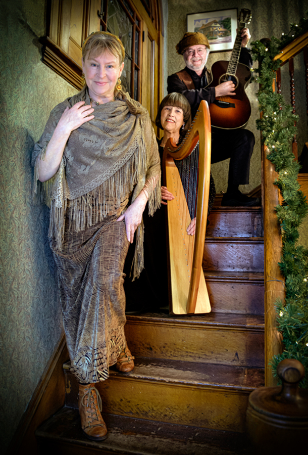 From left to right: Diane Edgecomb, Margot Chamberlain, and Tom Megan. In “Ceyx and Alcyone,” Diane performs as the narrator, Margot performs vocals and harp music, and Tom Megan plays other instrumentals. (Photo: Pamela Ruby Russell)