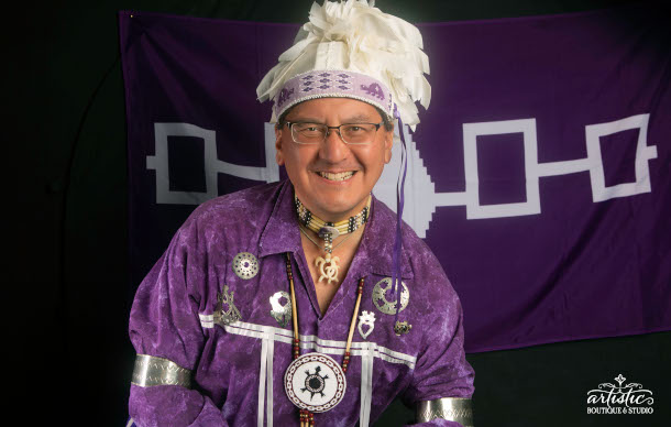 Perry Ground with Haudenosaunee (Iroquois) flag in the background. The white rectangles symbolize the unity of the original Five Nations of the Iroquois (Seneca, Cayuga, Onondaga, Oneida, Mohawk). (Photo: Artistic Boutique & Studio Perry)