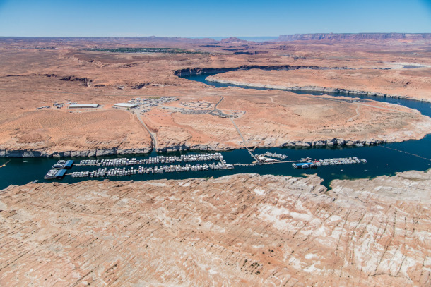 Antelope Point marina is located in the dwindling Lake Powell, the nation’s second largest reservoir and a crucial part of the Colorado River water supply. (Photo: Alexander Heilner, The Water Desk with support from LightHawk)