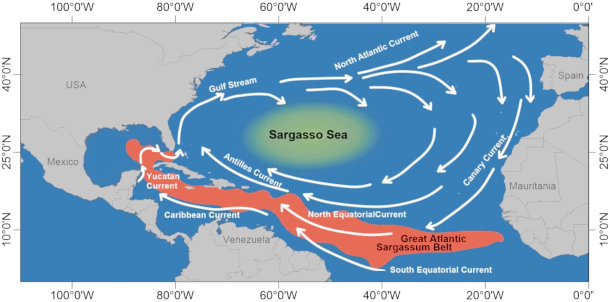 The Great Atlantic Sargassum Belt covers about 5,000 miles from the Gulf of Mexico to the West Coast of Africa. (Photo: López Miranda JL, Celis LB, Estévez M, Chávez V, van Tussenbroek BI, Uribe-Martínez A, Cuevas E, Rosillo Pantoja I, Masia L, Cauich-Kantun C and Silva R, Wikimedia Commons, CC BY 4.0)