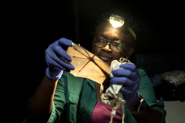 Iroro releasing a bat after data collection in Odukpani, Cross River State. (Photo: Etinosa Yvonne for the Goldman Environmental Prize)