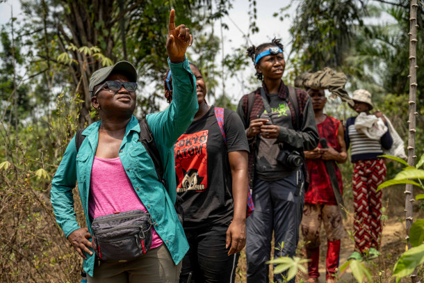 Iroro Tanshi (front) shows her team how to set bat traps in Odukpani, Cross River State, Nigeria. (Photo: Etinosa Yvonne for Goldman Environmental Prize)