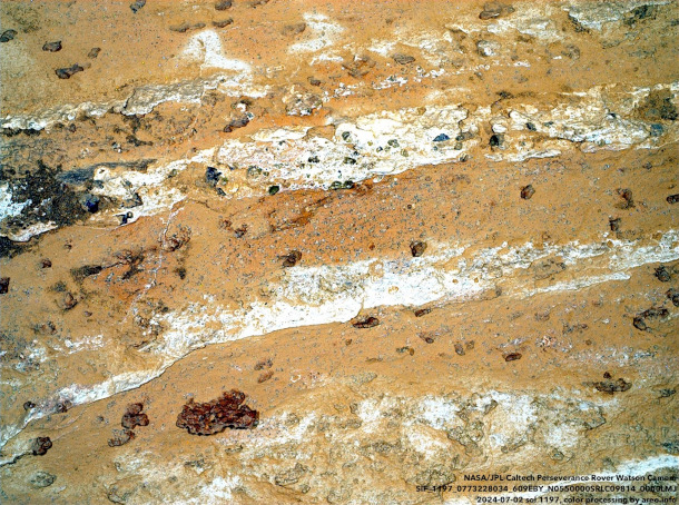 An image taken by the Perseverance Rover at the Cheyava Falls boulder site on Mars. A rock sample collected by the rover, nicknamed “Sapphire Canyon,” appears to show patterns associated with microbial activity and compounds that usually form in the presence of life. It’s not yet a confirmation, though, of a history of life on Mars. (Photo: color processing by areo.info, raw data by NASA/JPL-Caltech, Wikimedia Commons, CC BY 4.0)