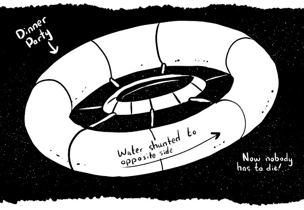 One proposed strategy for mimicking Earth gravity in the vacuum of space involves the use of something called a rotating wheel space station. (Image: Drawn by Zach Weinersmith)