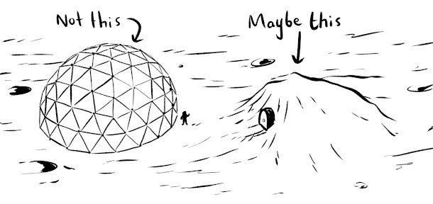 KELLY WEINERSMITH: Yeah, very dry concrete, yeah. And so if you want water on the moon, you have to go to the poles. And in the poles, there are these craters, and inside the craters there's water trapped as ice, and it's so cold that it's like rock, but it's still there, and it's contaminated. It'll need to get cleaned up, but there's water there. And those craters are also important because the rims of the craters would be great places to set up solar panels. So if you are at the equator, you have a period of time that's equivalent to two weeks here on Earth where you're in total darkness. So their nights are really long, and the number of battery packs that you would need to bring with you is prohibitive. So we're probably not going to be relying on solar power at the equator.