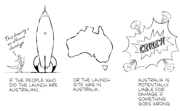 The Outer Space Treaty states that the supervising nation is legally responsible for both governmental and non-governmental activities in outer space. (Image: Drawn by Zach Weinersmith)