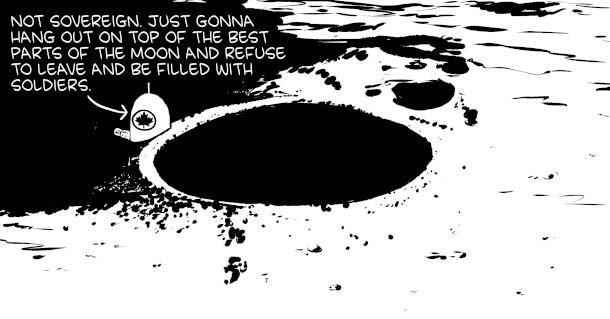 A “quasi-sovereignty” could hypothetically be set up at one of the poles of the Moon without directly being claimed. (Image: Drawn by Zach Weinersmith)