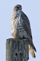 MCCANN: Winter sends wondrous birds down from the Arctic. Unrivalled among these visitors is the majestic Gyrfalcon. Gyrfalcons are among the largest falcons in the world, with the female—the larger of the sexes—outranking even a Red-tailed Hawk in size.