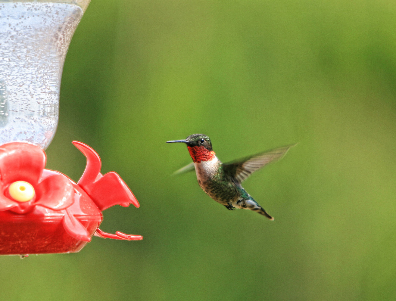 A ruby-throated hummingbird, the hummingbird most commonly spotted in the Northeast, hovers above a backyard feeder. (Photo: Cheryl Gayser for Hummingbirds at Home)