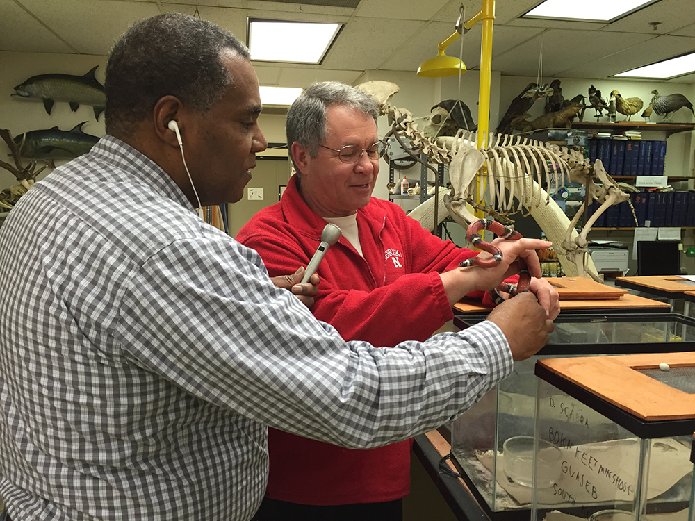 CURWOOD: But not every exhibit in Jim’s lab is long dead. We walk over to a series of tanks filled with snakes.