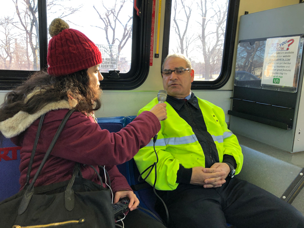 Reporter Paloma Beltran speaks with Luis who has been a bus driver with the Merrimack Valley Transit Authority for 26 years. He forms part of the Lawrence community and has seen new riders riding the bus after the free bus program began. (Photo: Bobby Bascomb, Living on Earth)
