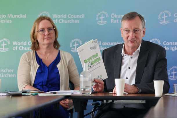 Frederique Seidel, World Council of Churches Senior Program Lead on Children and Climate (left) and Peter Prove, WCC Director for International Affairs (right), at the handbook launch in April 2025. (Photo: Ivars Kupcis/WCC)