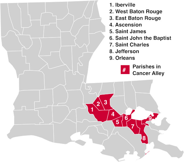 Shown here is a graphic depicting the 9 parishes of Louisiana’s Cancer Alley. (Graphic: WWWHHHHYYYYYY, Wikimedia Commons, Public Domain)