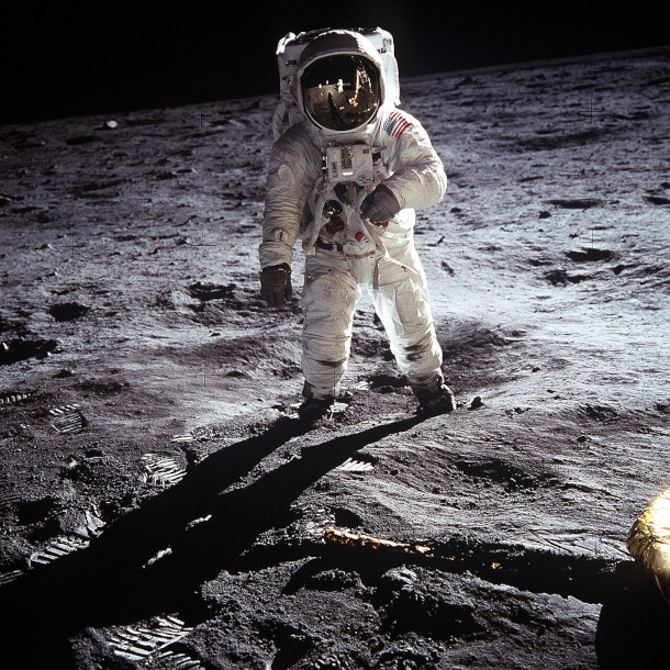 Apollo 11 was the first mission to land humans on the moon, including astronaut Buzz Aldrin (pictured above) in 1969. NASA now plans to put humans back on the Moon again in 2028. Throughout the 1970s, Congress defunded NASA as it grappled with an expanding budget deficit and rising costs of geopolitical conflicts. (Photo: Neil A. Armstrong, Wikimedia Commons, CC0)