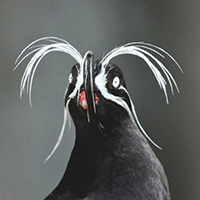 Whiskered Auklets are miniature relatives of puffins and murres. Charcoal gray, they're about eight inches long and owe their name to the long, slender, white plumes that sprout from their heads each summer — two rows down the side of the face and a third set that stands like antennae above their eyes. These fancy white plumes very likely play a visual role in courtship and mate selection. But they're not just for show.