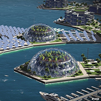 An artist’s concept of a seastead styled “Artisanopolis”, which would feature aquaponics greenhouse domes for growing food. (Photo: courtesy of Gabriel Scheare, Luke Crowley, Lourdes Crowley, and Patrick White, Chile)
