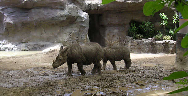 Emi (mother, foreground) and Suci (baby, background), two of the Sumatran rhinos at the Cincinnati Zoo in 2006. (Photo: MrsApplegate, Flickr, CC BY-NC-ND 2.0)