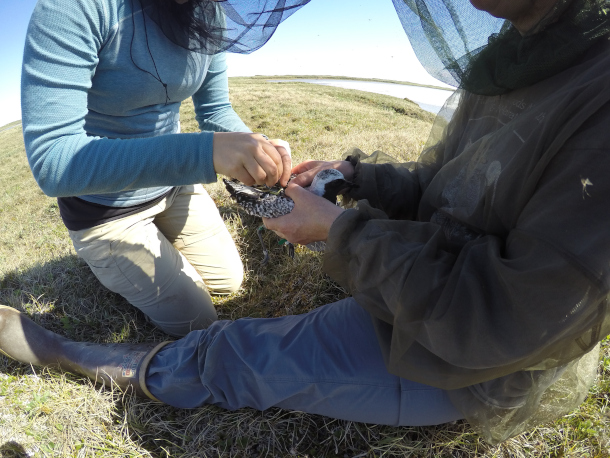 Harrison and colleague Lee Tibbitts attaching a satellite tag to a black-bellied plover. (Photo: Elyse Gottesman)