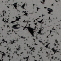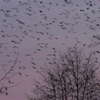 So, just how many crows are there in a roost? That varies, but at one long-time roost in Danville, Illinois, locals have counted more than 100,000 crows! Not that the folks of Danville are especially happy about that. Imagine the ruckus when the first few thousand crows leave in the morning, about an hour before sunrise. [Huge flock of crows]