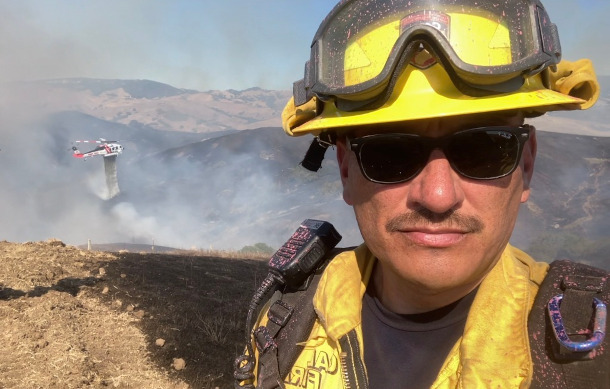 Our guest, Eddie Herrera Jr. at the Green Fire in San Luis Obispo County in 2024. Herrera worked his way up from being an incarcerated firefighter to being a fire apparatus engineer for the state of California. (Photo: Courtesy of Eddie Herrera Jr.)