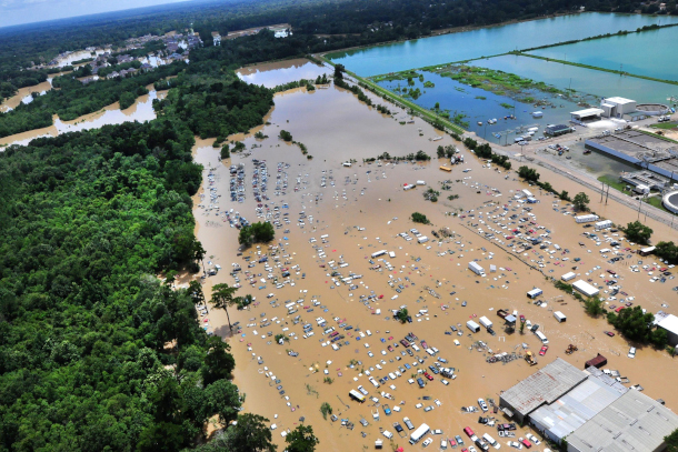 Pictured above is a view from an MH-65 Dolphin helicopter showing flooding and devastation in Baton Rouge, LA on Aug. 15, 2016. (Photo: Melissa Leake, Coast Guard, Wikimedia Commons, CC BY 2.0)