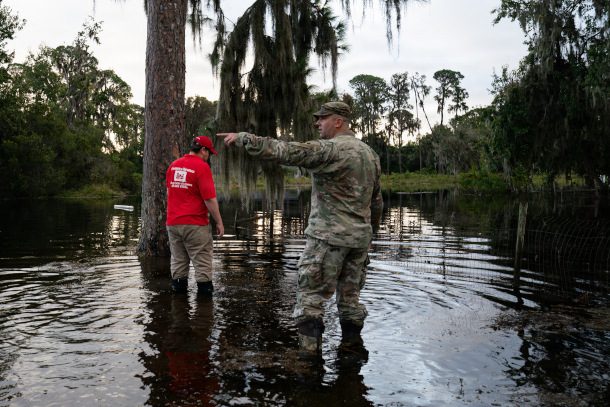 Pictured above is U.S. Army Corps of Engineers (USACE) Jacksonville District Deputy Commander Maj. Matthew Westcott (right) and his liaison officer (Jake Edwards, left), responding to flood impacted communities in Lake County Florida. Florida was one of the many states impacted by FEMA’s cut to the BRIC program. (Photo: US Army photo, Brigida I. Sanchez, Wikimedia Commons, Public Domain)