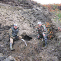 The woolly rhino DNA was discovered in the stomach of a mummified wolf puppy found in this piece of permafrost in the Russian village of Tumat. Pictured above is a coauthor of the paper, Sergey Fedorov (right) and a local colleague. (Photo: Sergey Fedorov, courtesy of J. Camilo Chacón-Duque)