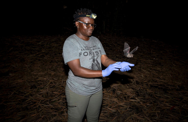Iroro releasing a bat after data collection in Odukpani, Cross River State. (Photo: Etinosa Yvonne for the Goldman Environmental Prize)